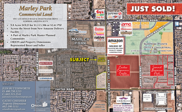 9.8 Acres Across from Amazon Facility in Surprise Sells for $1.13M Article originally posted on AZ Big Media on March 4, 2021 9.8 acres of commercially zoned land located at the SWC of Litchfield Road and Sweetwater Avenue in Surprise traded recently for $1,113,306 or $2.61 per square foot, plus $0.48 per square foot additional to pay to Surprise at the time of development for road improvements on Sweetwater. Judi Butterworth of The Moser Group USA and Cathy Cheshier of Property Dimensions Real Estate Group, Inc. represented the Seller, Veramonte Land Holdings LLLP, and the Buyer, Terry Brodkin (Sweetwater 9.8 LLC). The land parcel is right across the street from the new 30-acre Amazon Delivery Facility at the NEC. Amazon will provide 1,339 parking spaces for delivery drivers, plus 331 parking spaces strictly for employees. The package delivery facility will operate similar to other providers like USPS, UPS, and FedEx. The site is adjacent to the upscale Marley Park community in Surprise, which is known for “Scottsdale” incomes with young families. The last phase of housing is under construction right now. Surprise is the second-fastest expanding municipality in the greater Phoenix metropolitan area, and is projected to have over 217,000 residents and 60,000 jobs in 2030. Judi Butterworth commented on the land transaction, “This prime Surprise Investment parcel has a wide range of zoning options—from retail to business park, medical to flex buildings. With all arterials fully improved, this property is ready for development.” READ ALSO: How Amazon has impacted the Arizona economy September 24, 2021 Here’s how Arizona’s Recovery From Pandemic is Gaining Momentum ‘Timing is Right’ for Redevelopment of Tempe Flour Mill, City Says Household Net Worth in U.S. Hits Record on Surging Home Values Avondale Approves Rezoning for 22-Acre Mixed-Use Development Near Interstate 10 Population Migration Is Fueling Economic Growth September 23, 2021 What the Fed’s Monetary Plans Mean for CRE Texas Developer to Break Ground on $100M Apartments in Midtown Phoenix Phoenix No. 1 in Home Price Increases for 25 Consecutive Months Phoenix Warehouse Sells for Record Price, Extending Region’s Demand Surge Economist Tells AZ Audience: US Economy to Have 2 Strong Years, Then Level Back to Before Covid
