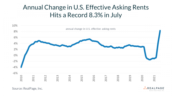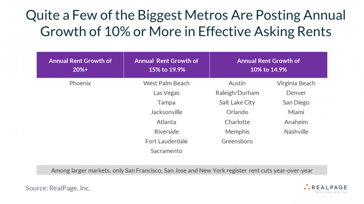 According to a new report from RealPage, the leading provider of software and data analytics to the real estate industry, effective asking rents in Phoenix grew 3.4 percent in July, the second largest monthly hike in the nation. That big Phoenix apartment rent monthly increase took rents up 21.6 percent year-over-year, the largest annual apartment rent increase among the nation’s 50 largest apartment markets. Some additional highlights specific to Phoenix apartment rent include: • By comparison, U.S. rents jumped 2.2 percent in July and were up 8.3 percent year-over-year. Annual rent growth hit an all-new record high, surpassing the last record set in 2000 and 2001 during the dot-com boom. • Average effective asking rents are at $1,483 per month in Phoenix, still about $66 below the U.S. average. • Phoenix apartment occupancy climbed 1.6 percentage points in the last year, to 97.3 percent in July. The national average for apartment occupancy stands at 96.9 percent, an all-time high. The performance momentum seen in the nation’s apartment market continued in July, when both rent growth and occupancy reached new all-time highs. Effective asking rents jumped 2.2% just in the month of July, driving prices up 8.3% year-over-year. That annual rent growth shot past the previous record set in the 2000-2001 time period. The country’s average monthly rent has reached $1,549. Pushing rents upward, occupancy is also now at a new all-time record level. Today’s rate is at 96.9%, again surpassing the earlier highs established in 2000-2001. Momentum in the country’s apartment market performance metrics likely is peaking right now. Leasing activity normally begins to slow in the last half of the 3rd quarter. In turn, apartment property owners and operators tend to get a little less aggressive when pricing units. In similar timing, occupancy usually peaks in July or August and then backs up slightly as the year moves toward its conclusion. Big Rent Growth Remains Widespread Annual growth in effective asking rents comes in at more than 10% in 65 of the country’s 150 largest metros, including 22 spots where year-over-year price increases are at 15% or more. Relatively small Boise, ID posts the most aggressive annual rent growth in that 150-metro group of markets, with pricing up 24.2%. Looking specifically at bigger places with at least 100,000 apartment units, Phoenix registers 21.6% annual rent growth, and there are price hikes of roughly 19% across West Palm Beach, Las Vegas and Tampa. Annual rent growth is at 15% to 17% across Jacksonville, Atlanta, Riverside/San Bernardino, Fort Lauderdale and Sacramento. Another 13 big metros register annual price increases of 10% or more, including Austin, Denver and Southeast demand hot spots like Raleigh/Durham, Orlando, Charlotte, Miami and Nashville. Most of the country’s key gateway metros that recorded rent cuts in 2020 now post moderate annual rent growth. Effective asking rents are up 4% to 5% year-over-year in Chicago, Boston and Los Angeles. Annual price increases around 2% to 3% are seen in Seattle, the Washington, DC area, Newark/Jersey City and Oakland. However, yearly price moves still aren’t yet back in positive territory in San Francisco (-5.9%), San Jose (-2.1%) and New York (-1.6%). The only other spot across the country suffering rent loss is the West Texas Oil Patch, where annual rent change is at -5.3% in Midland/Odessa. Small Metros Are Occupancy Leaders Small markets dominate the list of the country’s apartment occupancy leaders, in part because there’s so little construction activity in these locations. Occupancy reaches 99% or better in a trio of small-metro locations: Salisbury, MD in the Eastern Shore cluster of small towns with fishing, farming and tourism-focused economies, as well as Allentown, PA and Eugene, OR. Among big metros, occupancy leaders are Providence, Riverside/San Bernardino, San Diego, Virginia Beach and Anaheim. All have occupancy rates that reach 98% or better as of July. Only a handful of spots register less-than-full occupancy rates. Midland/Odessa continues to struggle notably, with occupancy at only 89.2%. The next lowest occupancy figure is the 92.7% in College Station/Bryan, TX. Houston, San Francisco and San Antonio are the big metro occupancy laggards, but even in those locations the performance really isn’t bad at roughly 95%.