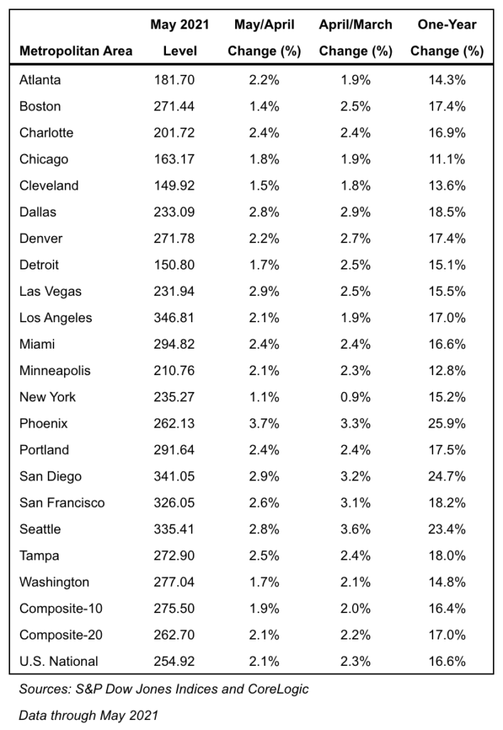 Phoenix Leads Nation With 25.9% Home Price Increase Article originally posted on AZ Big Media on July 28, 2021 S&P Dow Jones Indices (S&P DJI) today released the latest results for the S&P CoreLogic Case-Shiller Indices, the leading measure of U.S. home prices. Data released today for May 2021 show that home prices continue to increase across the U.S. More than 27 years of history are available for the data series, and can be accessed in full by going to https://www.spglobal.com/spdji/. The Phoenix home price increase leads the nation, according to the report. “Phoenix’s 25.9% increase led all cities for the 24th consecutive month, with San Diego (+24.7%) and Seattle (+23.4%) close behind,” says Craig J. Lazzara, Managing Director and Global Head of Index Investment Strategy at S&P DJI. “As was the case last month, prices were strongest in the West (+19.9%) and Southwest (+19.8%), but every region logged double-digit gains.” The table below summarizes the results for May 2021, including the Phoenix home price increase. The S&P CoreLogic Case-Shiller Indices could be revised for the prior 24 months, based on the receipt of additional source data. YEAR-OVER-YEAR The S&P CoreLogic Case-Shiller U.S. National Home Price NSA Index, covering all nine U.S. census divisions, reported a 16.6% annual gain in May, up from 14.8% in the previous month. The 10-City Composite annual increase came in at 16.4%, up from 14.5% in the previous month. The 20-City Composite posted a 17.0% year-over-year gain, up from 15.0% in the previous month. Phoenix, San Diego, and Seattle reported the highest year-over-year gains among the 20 cities in May. Phoenix led the way with a 25.9% year-over-year price increase, followed by San Diego with a 24.7% increase and Seattle with a 23.4% increase. All 20 cities reported higher price increases in the year ending May 2021 versus the year ending April 2021. MONTH-OVER-MONTH Before seasonal adjustment, the U.S. National Index posted a 2.1% month-over-month increase in May, while the 10-City and 20-City Composites both posted increases of 1.9% and 2.1%, respectively. After seasonal adjustment, the U.S. National Index posted a month-over-month increase of 1.7%, and the 10-City and 20-City Composites both posted increases of 1.7% and 1.8%, respectively. In May, all 20 cities reported increases before and after seasonal adjustments. ANALYSIS “Housing price growth set a record for the second consecutive month in May 2021,” says Craig J. Lazzara, Managing Director and Global Head of Index Investment Strategy at S&P DJI. “The National Composite Index marked its twelfth consecutive month of accelerating prices with a 16.6% gain from year-ago levels, up from 14.8% in April. This acceleration is also reflected in the 10- and 20-City Composites (up 16.4% and 17.0%, respectively). The market’s strength continues to be broadly-based: all 20 cities rose, and all 20 gained more in the 12 months ended in May than they had gained in the 12 months ended in April. Prices in 18 of our 20 cities now stand at all-time highs, as do the National Composite and both the 10- and 20-City indices. “A month ago, I described April’s performance as “truly extraordinary,” and this month I find myself running out of superlatives. The 16.6% gain is the highest reading in more than 30 years of S&P CoreLogic Case-Shiller data. As was the case last month, five cities – Charlotte, Cleveland, Dallas, Denver, and Seattle – joined the National Composite in recording their all-time highest 12-month gains. Price gains in all 20 cities were in the top quartile of historical performance; in 17 cities, price gains were in top decile. “We have previously suggested that the strength in the U.S. housing market is being driven in part by reaction to the COVID pandemic, as potential buyers move from urban apartments to suburban homes. May’s data continue to be consistent with this hypothesis. This demand surge may simply represent an acceleration of purchases that would have occurred anyway over the next several years. Alternatively, there may have been a secular change in locational preferences, leading to a permanent shift in the demand curve for housing. More time and data will be required to analyze this question. “Phoenix’s 25.9% increase led all cities for the 24th consecutive month, with San Diego (+24.7%) and Seattle (+23.4%) close behind. As was the case last month, prices were strongest in the West (+19.9%) and Southwest (+19.8%), but every region logged double-digit gains.”