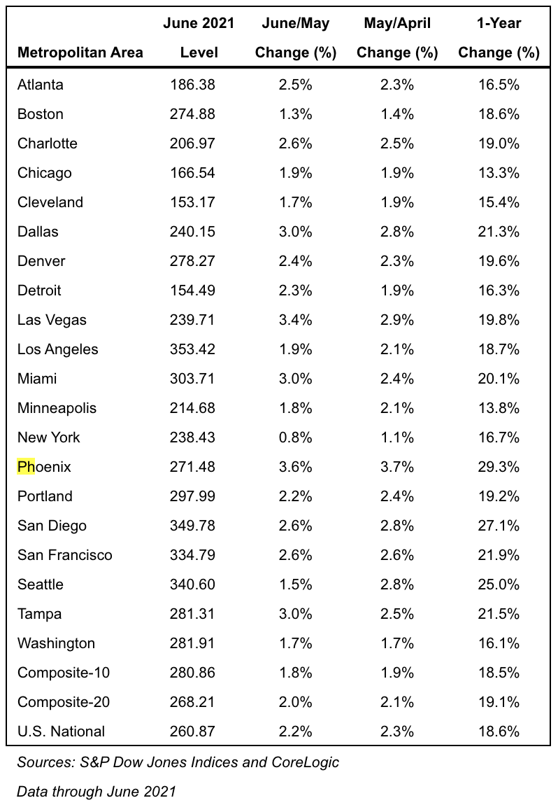 Phoenix Leads Nation With 29.3% Year-Over-Year Home Price Increase Article originally posted on AZ Big Media on August 31, 2021 S&P Dow Jones Indices (S&P DJI) today released the latest results for the S&P CoreLogic Case-Shiller Indices, the leading measure of U.S. home prices. Data released today for June 2021 show that home prices continue to increase across the U.S. and Phoenix leads the way with a 29.3% year-over-year home price increase. More than 27 years of history are available for the data series and can be accessed in full by going to https://www.spglobal.com/spdji/. Phoenix home price increase The S&P CoreLogic Case-Shiller U.S. National Home Price NSA Index, covering all nine U.S. census divisions, reported a 18.6% annual gain in June, up from 16.8% in the previous month. The 10-City Composite annual increase came in at 18.5%, up from 16.6% in the previous month. The 20-City Composite posted a 19.1% year-over-year gain, up from 17.1% in the previous month. Phoenix, San Diego, and Seattle reported the highest year-over-year gains among the 20 cities in June. Phoenix led the way with a 29.3% year-over-year price increase, followed by San Diego with a 27.1% increase and Seattle with a 25.0% increase. All 20 cities reported higher price increases in the year ending June 2021 versus the year ending May 2021. Month-over-month Before seasonal adjustment, the U.S. National Index posted a 2.2% month-over-month increase in June, while the 10-City and 20-City Composites both posted increases of 1.8% and 2.0%, respectively. After seasonal adjustment, the U.S. National Index posted a month-over-month increase of 1.8%, and the 10-City and 20-City Composites both posted increases of 1.6% and 1.8%, respectively. In June, all 20 cities reported increases before and after seasonal adjustments. Analysis “June 2021 is the third consecutive month in which the growth rate of housing prices set a record,” says Craig J. Lazzara, Managing Director and Global Head of Index Investment Strategy at S&P DJI. “The National Composite Index marked its thirteenth consecutive month of accelerating prices with an 18.6% gain from year-ago levels, up from 16.8% in May and 14.8% in April. This acceleration is also reflected in the 10- and 20-City Composites (up 18.5% and 19.1%, respectively). The last several months have been extraordinary not only in the level of price gains, but in the consistency of gains across the country. In June, all 20 cities rose, and all 20 gained more in the 12 months ended in June than they had gained in the 12 months ended in May. Home prices in 19 of our 20 cities (all but Chicago) now stand at all-time highs, as do the National Composite and both the 10- and 20-City indices. “June’s 18.6% price gain for the National Composite is the highest reading in more than 30 years of S&P CoreLogic Case-Shiller data. This month, Boston joined Charlotte, Cleveland, Dallas, Denver, and Seattle in recording their all-time highest 12-month gains. Price gains in all 20 cities were in the top quartile of historical performance; in 19 cities, price gains were in top decile. “We have previously suggested that the strength in the U.S. housing market is being driven in part by reaction to the COVID pandemic, as potential buyers move from urban apartments to suburban homes. June’s data are consistent with this hypothesis. This demand surge may simply represent an acceleration of purchases that would have occurred anyway over the next several years. Alternatively, there may have been a secular change in locational preferences, leading to a permanent shift in the demand curve for housing. More time and data will be required to analyze this question. “Phoenix’s 29.3% increase led all cities for the 25th consecutive month, with San Diego (+27.1%) and Seattle (+25.0%) close behind. As has been the case for the last several months, prices were strongest in the Southwest (+22.7%) and West (+22.6%), but every region logged top-decile, double-digit gains.”